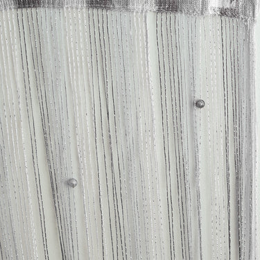 From the top curtain rod pocket, sparkling lines cascade downward and feature delightful metal-ball ornamentation randomly interspersed throughout the curtain strands.