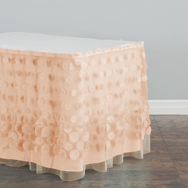 Our 21 ft. Cascading Ripples Table Skirts feature delicate, small multi-layered circles. As these "ripples" gently fall down the tulle skirting they slowly grow larger, creating a time lapse effect. Skirt attaches to the table using skirt clips and is made to completely wrap around standard 8 ft. banquet tables. Due to the sheer nature of this table skirt, we highly recommend using a tablecloth which will provide a full drop on your event table underneath the skirt.