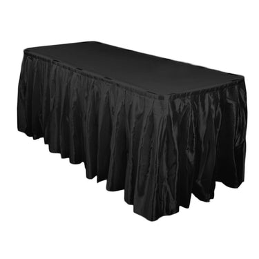 Table skirts are perfect for highlighting important event tables like sweetheart, buffet, and trade show displays. Our 21 ft. Accordion Pleat Satin Table Skirt completely wraps around standard 8 ft. rectangular or round tables. They feature a Velcro strip running the entire length of the skirt for ease of attachment to skirt clips-no safety pins necessary. Offering an elegant look with a classic accordion pleat, we recommend pairing table skirts with a rectangular tablecloth such as a 60 x 102 and 60 x 126 in.