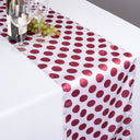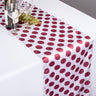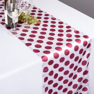 Playful dotted tablecloths create a whimsical setting with 1 1/4 in. Burgundy Dots over a delightful White background. White/Burgundy polka dot tablecloths are ideal for a birthday party, baby shower, or any other celebration. 100% polyester. Made in China.