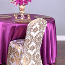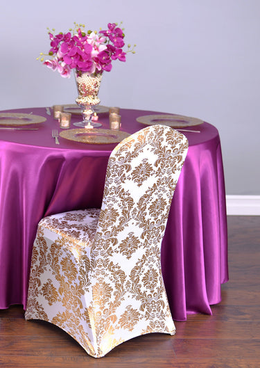 Featuring a glamorous metallic damask design, these stretch chair covers are made to conform to round top banquet chairs like spandex. This emphasizes the chairs shape with sleek, clean lines. Made for events you want to sparkle and shine, complete your dazzling look with satin tablecloths!